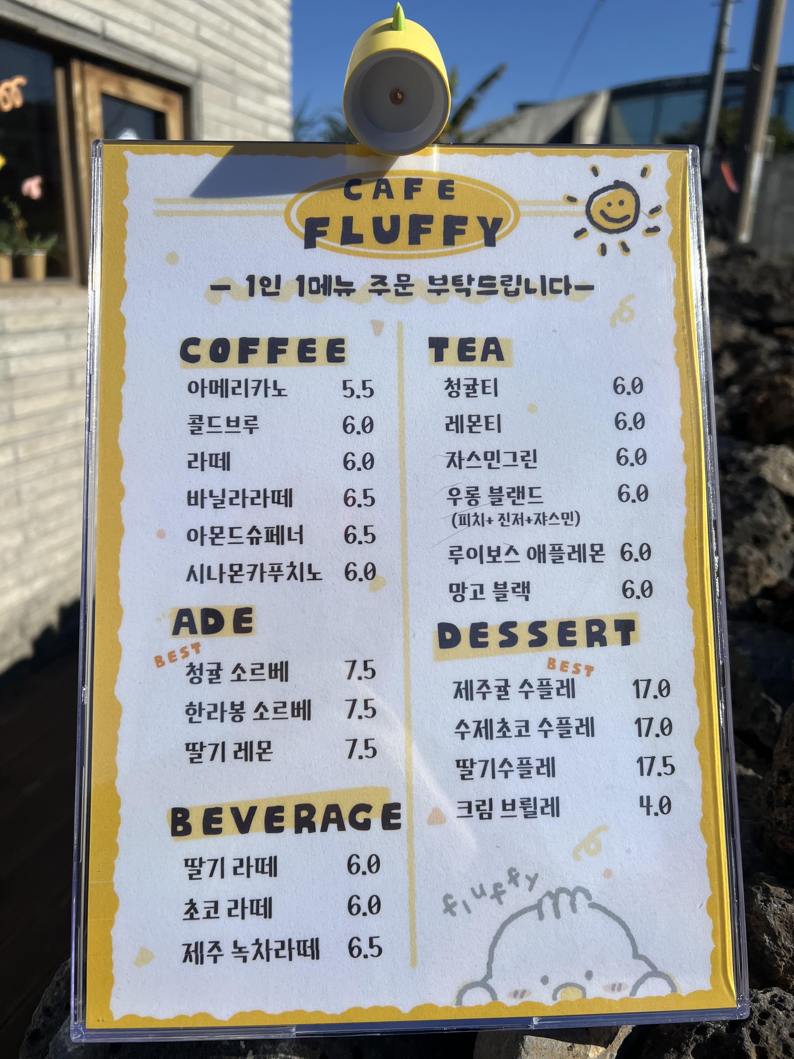 카페 플러피의 메뉴는 사진과 같은데요, 참고로 저는 아메리카노를 시켰는데 다른 분들이 드셨던 청귤 소르베를 보니 너무 맛보고 싶어 후회했답니다. 베스트인 이유가 있어보였어요...!