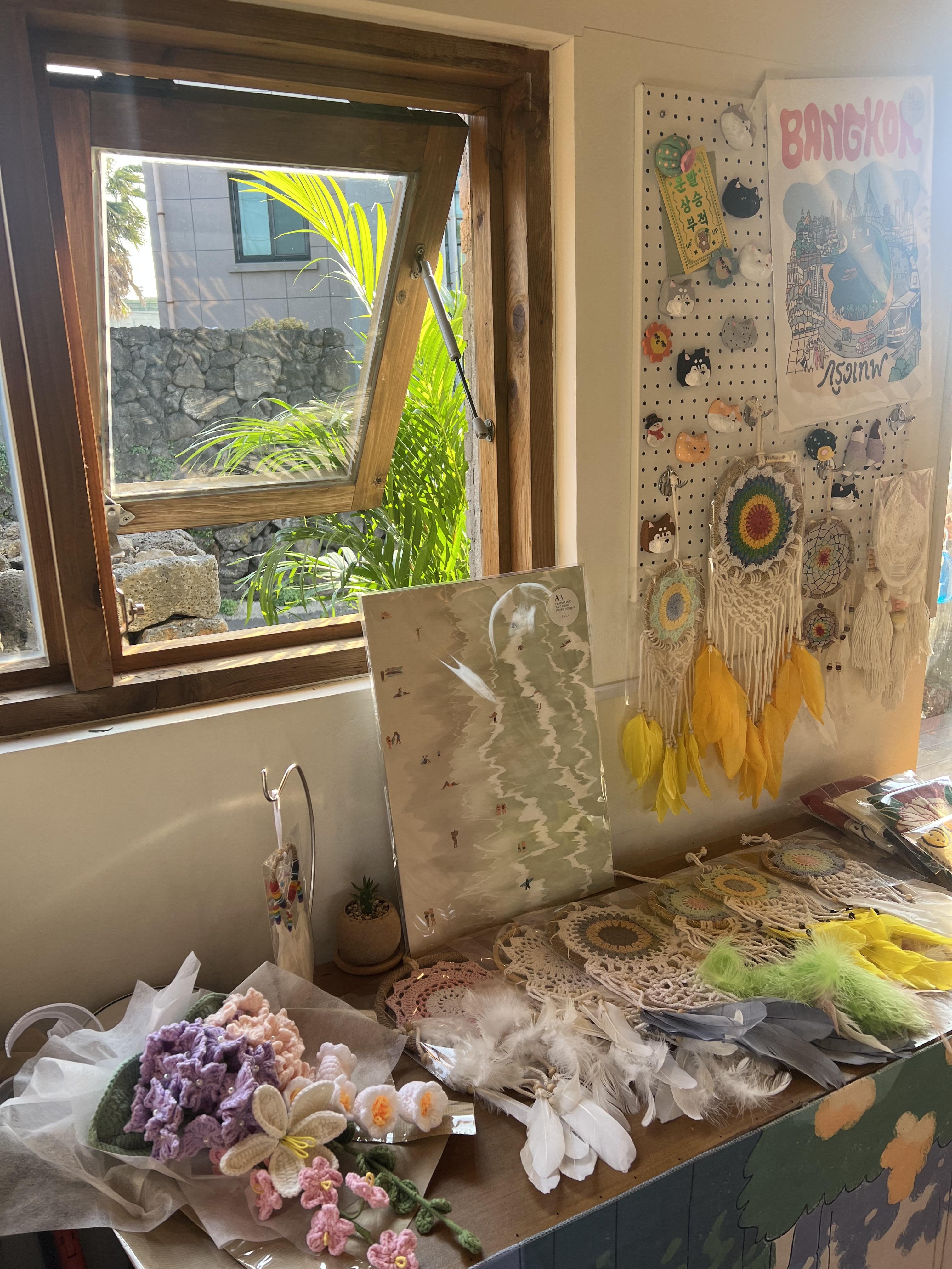 주문하는 공간엔 아기자기한 악세사리와, 귀여운 소품을 진열되어있어 구경하다 주문을 잊을 수도 있어 주의하셔야해요ㅎ 귀여운 거에 눈 못떼는 저에게는 개미지옥 그 자체였어요 ㅋㅋ큐ㅠㅠㅠㅠ 카페 구경하면서 듣기로는 사장님이 여행하며 사온 소품들이라고 하셨어요! 특히 드림 캐쳐와 스푼은 너무 구매하고 싶었는데 사재기할까봐 참았어요. 저처럼 음료와 수플레를 주문하고 소품을 구경하고 있으면 음료가 나온답니다.