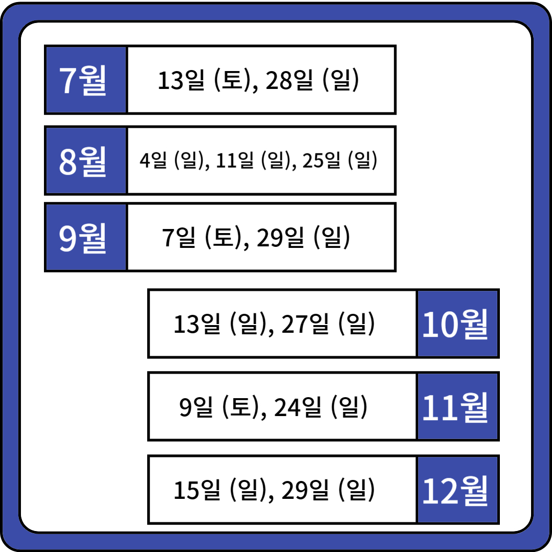 - 8월- 4일 (일), 11일 (일), 25일 (일)